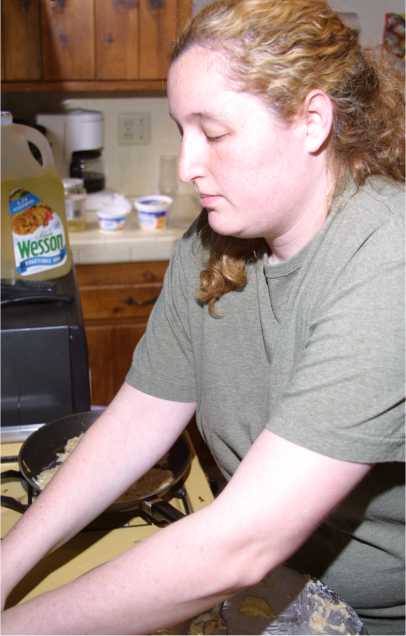 Rachael with her hands full of potatoes. |