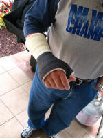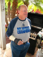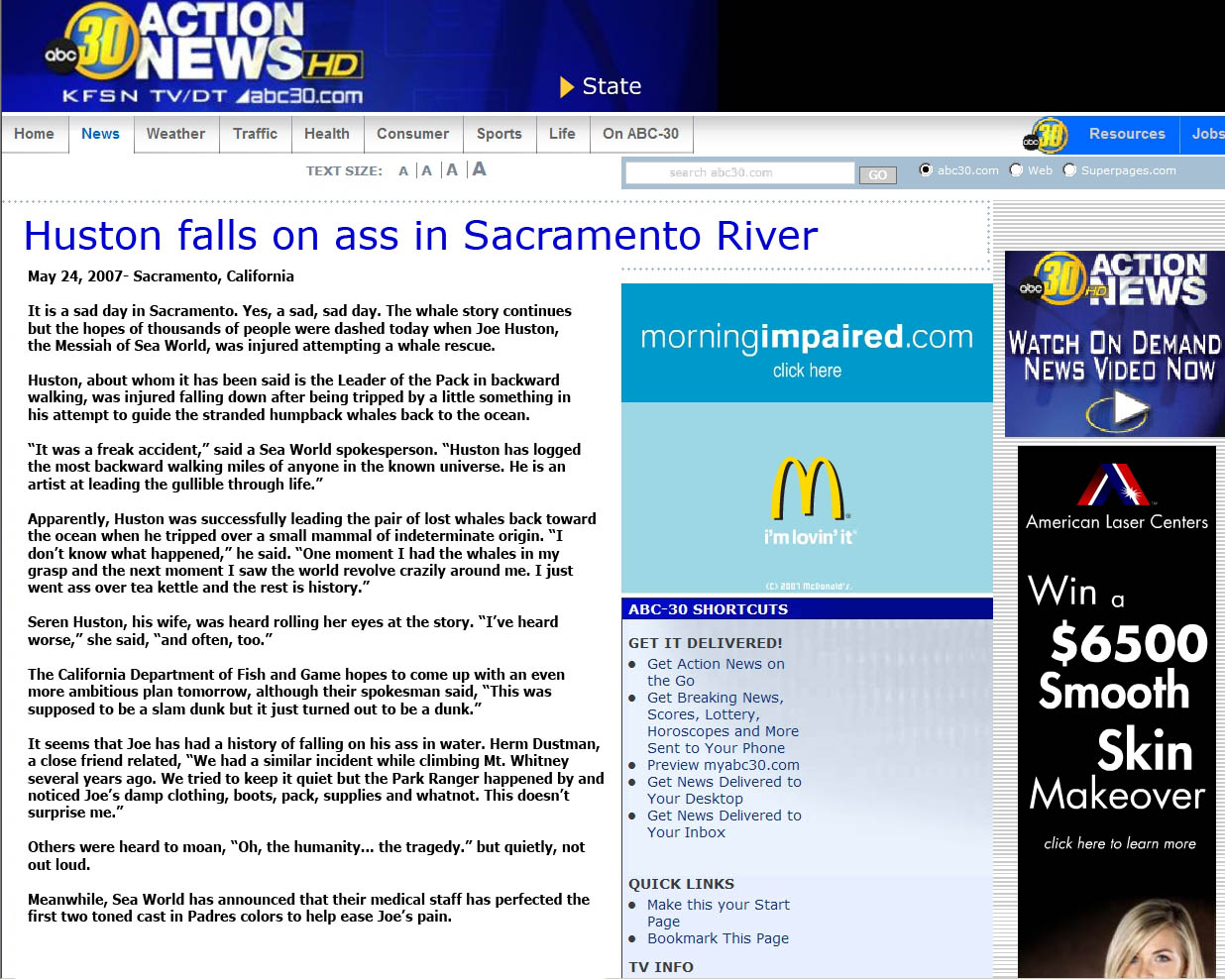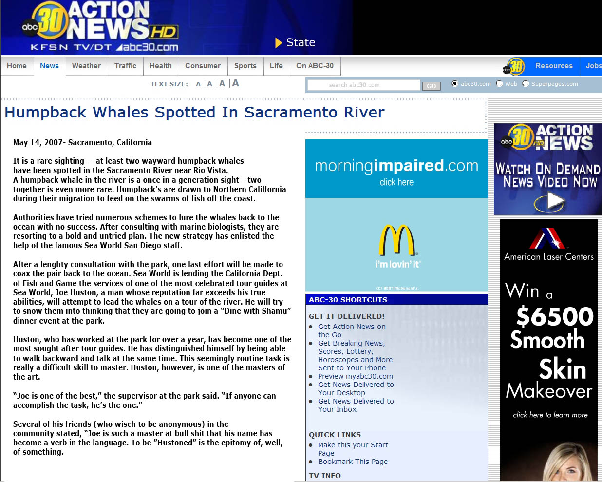 Saving The Whales! You know that Joe has become one of the premier tour guides at Sea World. You know that he is as happy as a dolphin in heat because he gets free beer (oops, sorry, free product). You know that he is a wealth of in and mis information. What you don't know is that he was pressed into service to try and save the lost whales in the Sacramento River. Yep... the California Department of Blubber called Sea World and asked for help. It seems that all the attempts to guide the whales went for naught. Those two tourists simply could not get back to the ocean waters and the authorities felt that they needed a really good tour guide to guide them back to the beach. So Sea World sent Joe up to try and help. It seems that Joe has felt jealous of the trainers who get the chance to become whale food. Since he can't swim worth a darn, getting pulled down by Shamu is out of the question. So Joe went north, jumped into the water to walk backwards and guide the whales down the river and the next thing he knew, he tripped over an errant manatee or something and fell into the muck and broke his wrist. The rest of the story is, as they say, total, complete and utter bull shit. Only the cast is real. Also, take a trip down memory lane with the ski accident. Click here. (Really, I wouldn't Huston you. Really. I wouldn't.) (Click on the little picture to see the big picture.) |